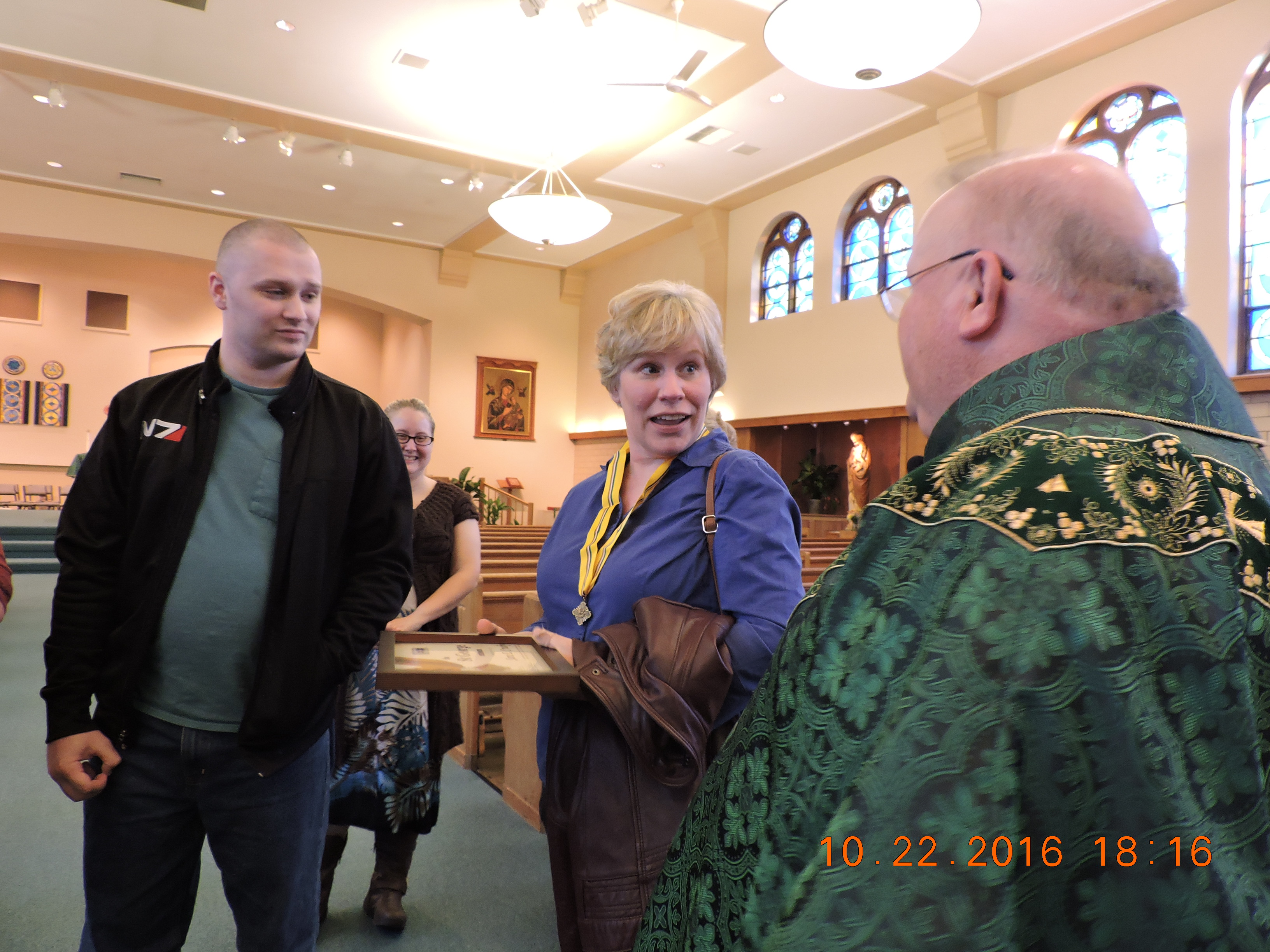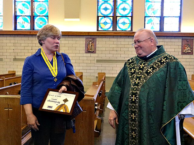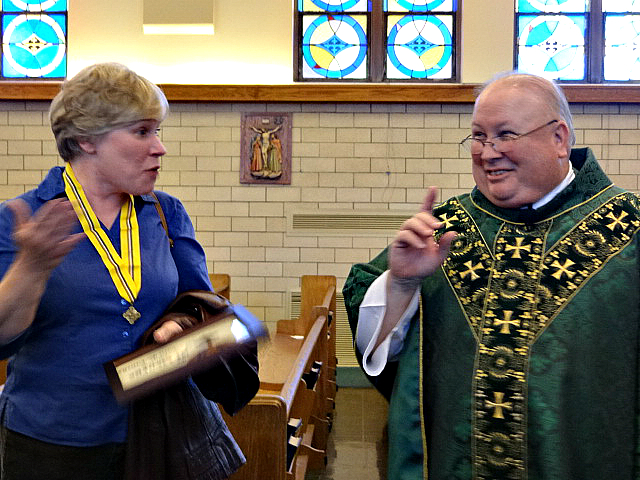 The Presentation at OLPH October 22nd, 2016 Watch the presentation of Sara's award Our thanks to Father Ritchie for all his help, Scott Moffett and Mike Pierson for their presentation, Gary Panzner for his photos and to Bill Paben for his video efforts. And last, but not least Mary, for all her help to set this up for her mother. | ||||||